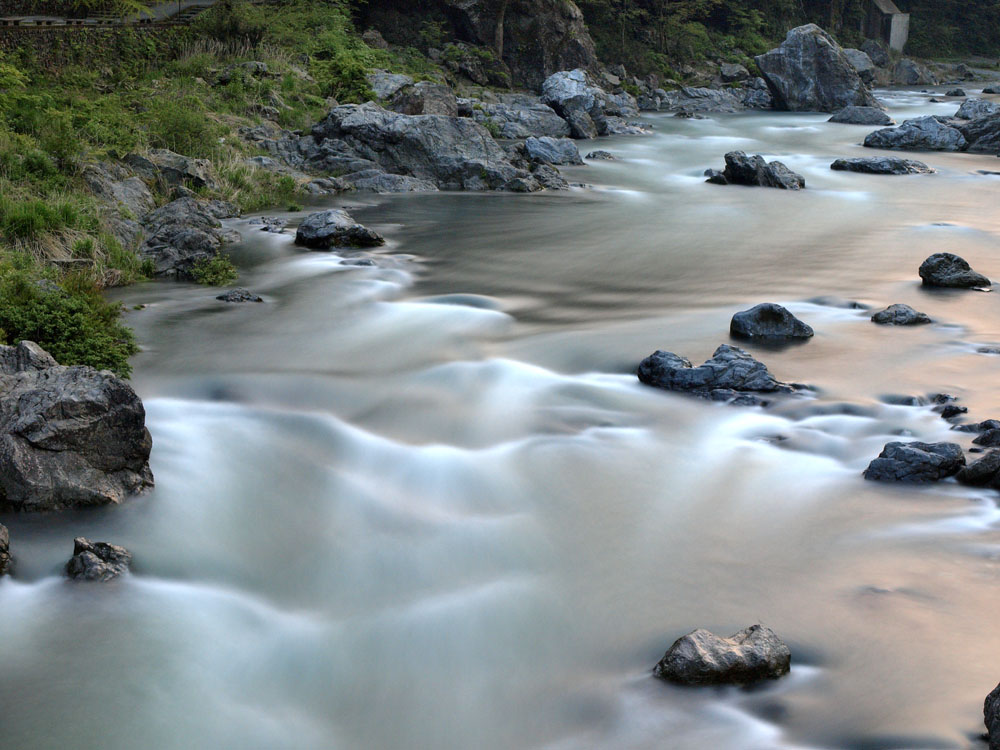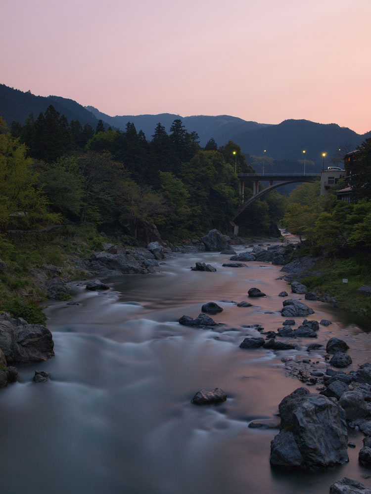 山間のかすかな夕焼けが、川面に映り込んで美しい。