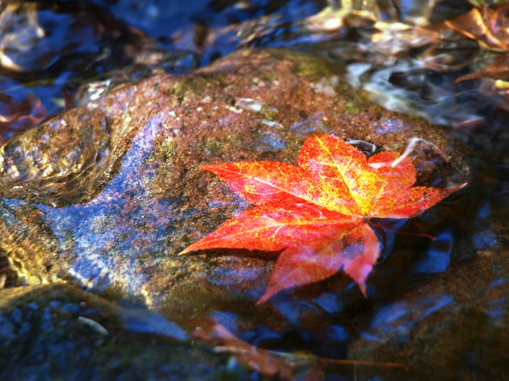 秋晴れの日差しの中、清流に遊ぶ一葉の椛(もみじ)。